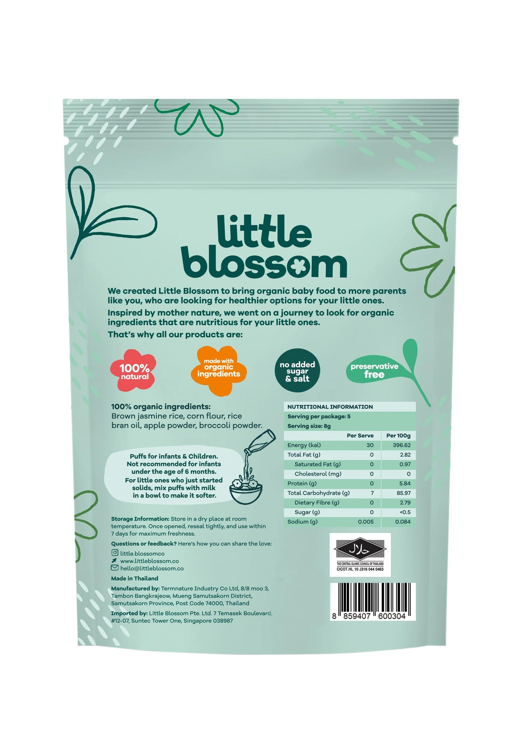 Little Blossom Baby Organic Brown Rice Puffs Apple & Broccoli Flavour Halal Certified 40g | Baby Snack Food