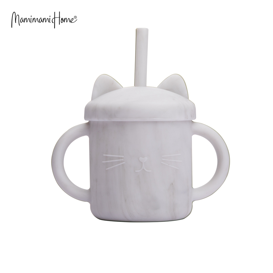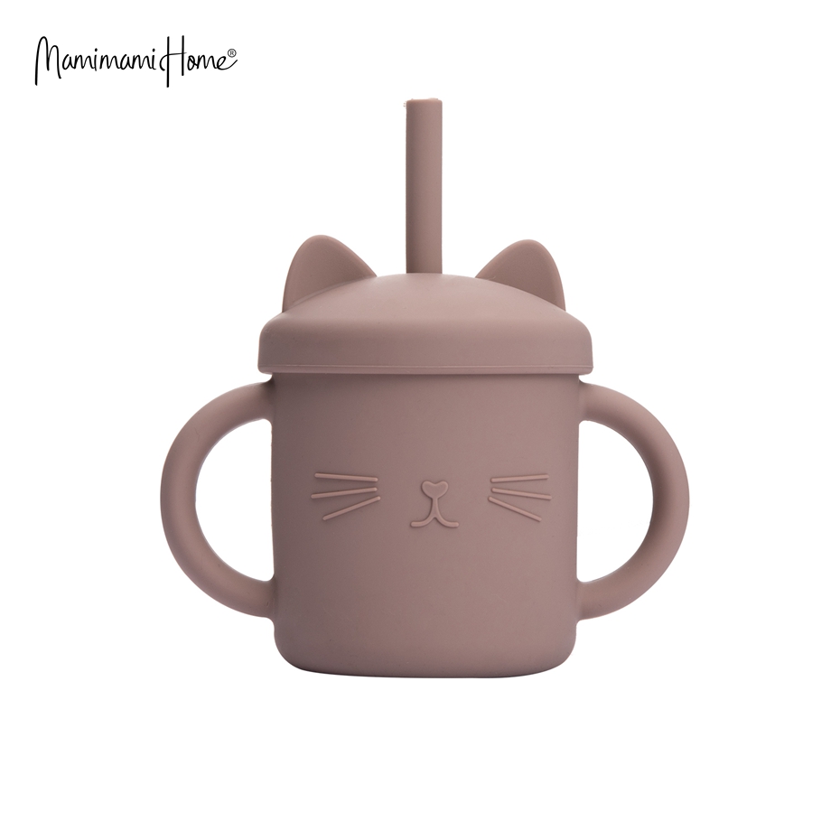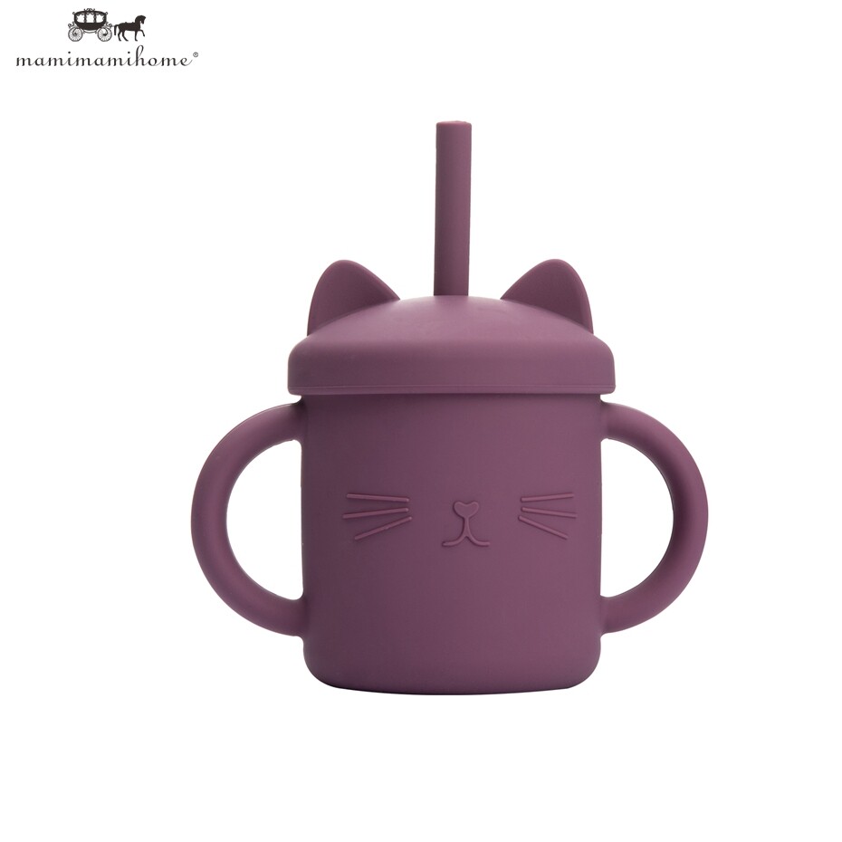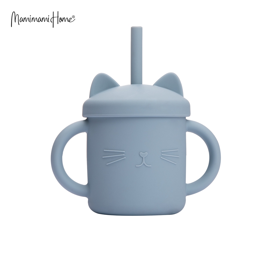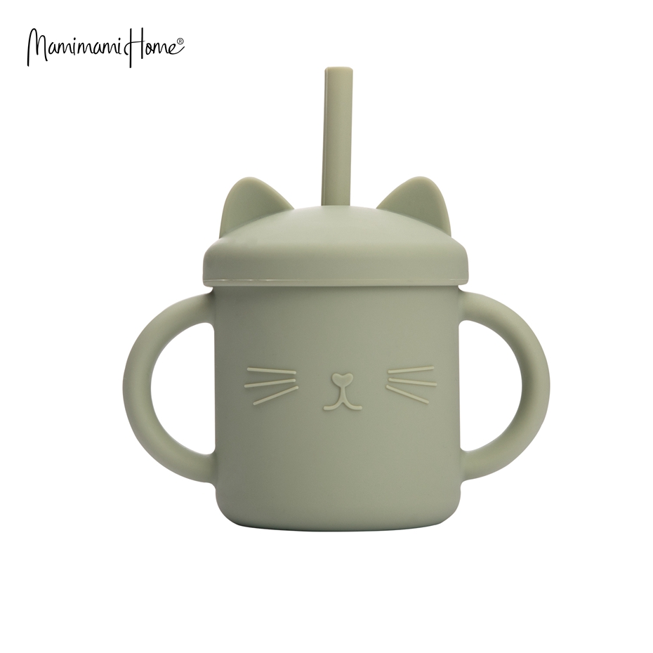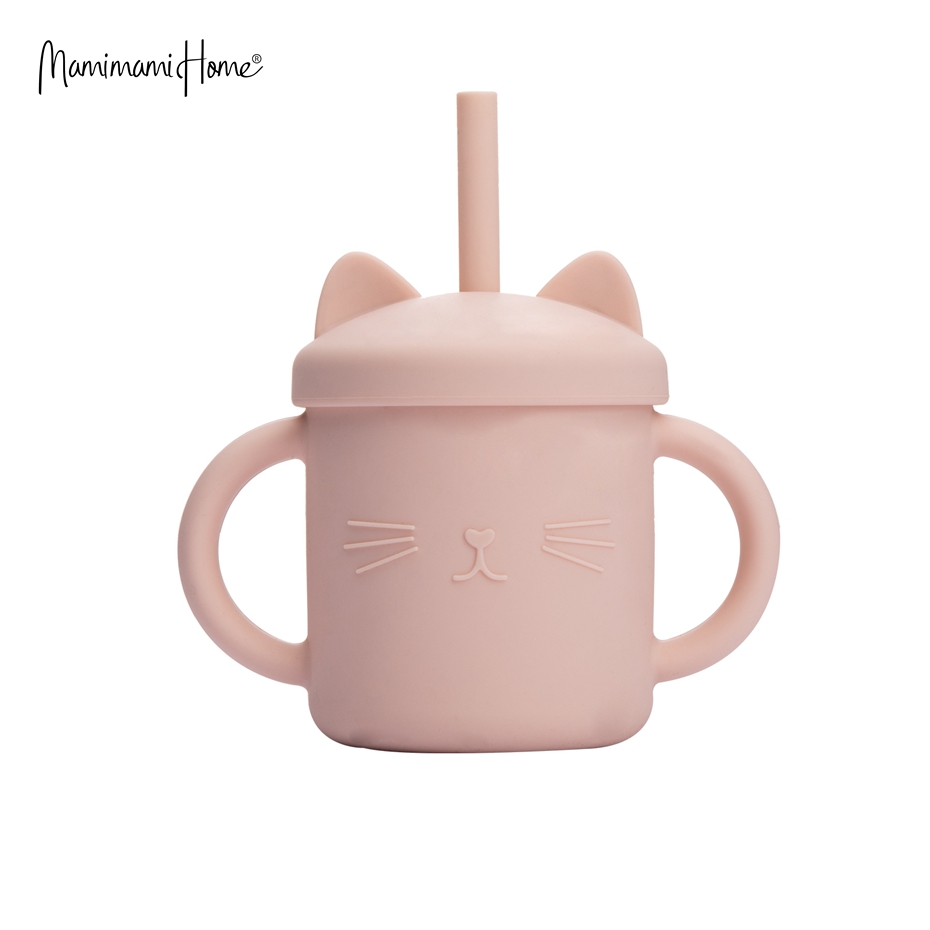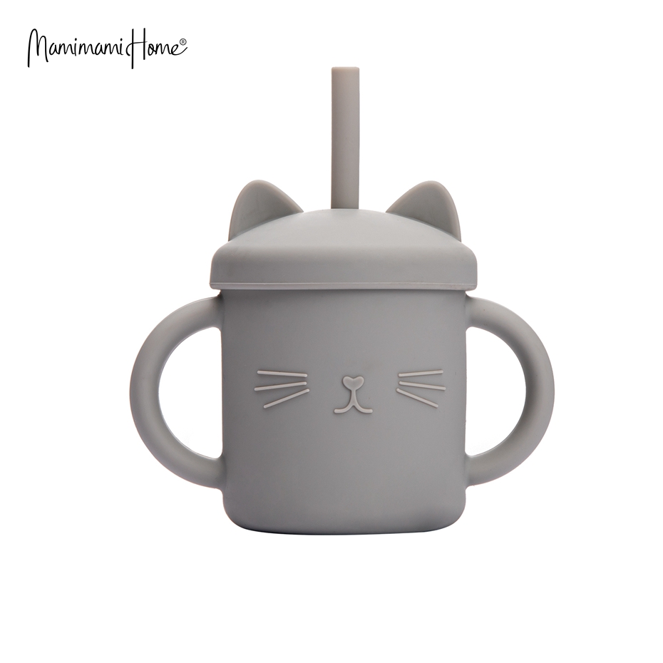 Mamimami Home Kids Sippy Cup 1PC 100% Food Grade Silicone Cups with Straw & Cover Cartoon Cat Baby Self-feeding Essentials