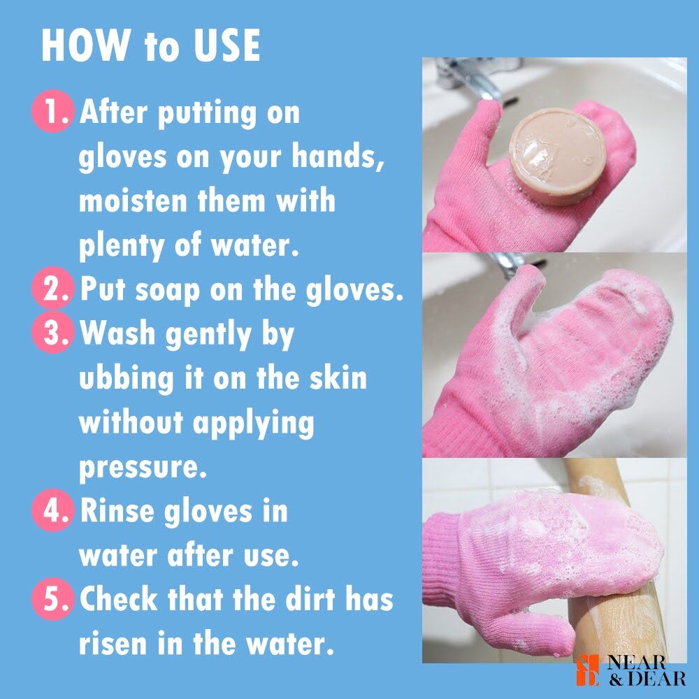 [How to Use]1. After putting on gloves on your hands, moisten them with plenty of water.2. Put soap on the gloves.3. Wash gently by rubbing it on the skin without applying pressure.4. Rinse gloves in water after use.5. Check that the dirt has risen in the water.