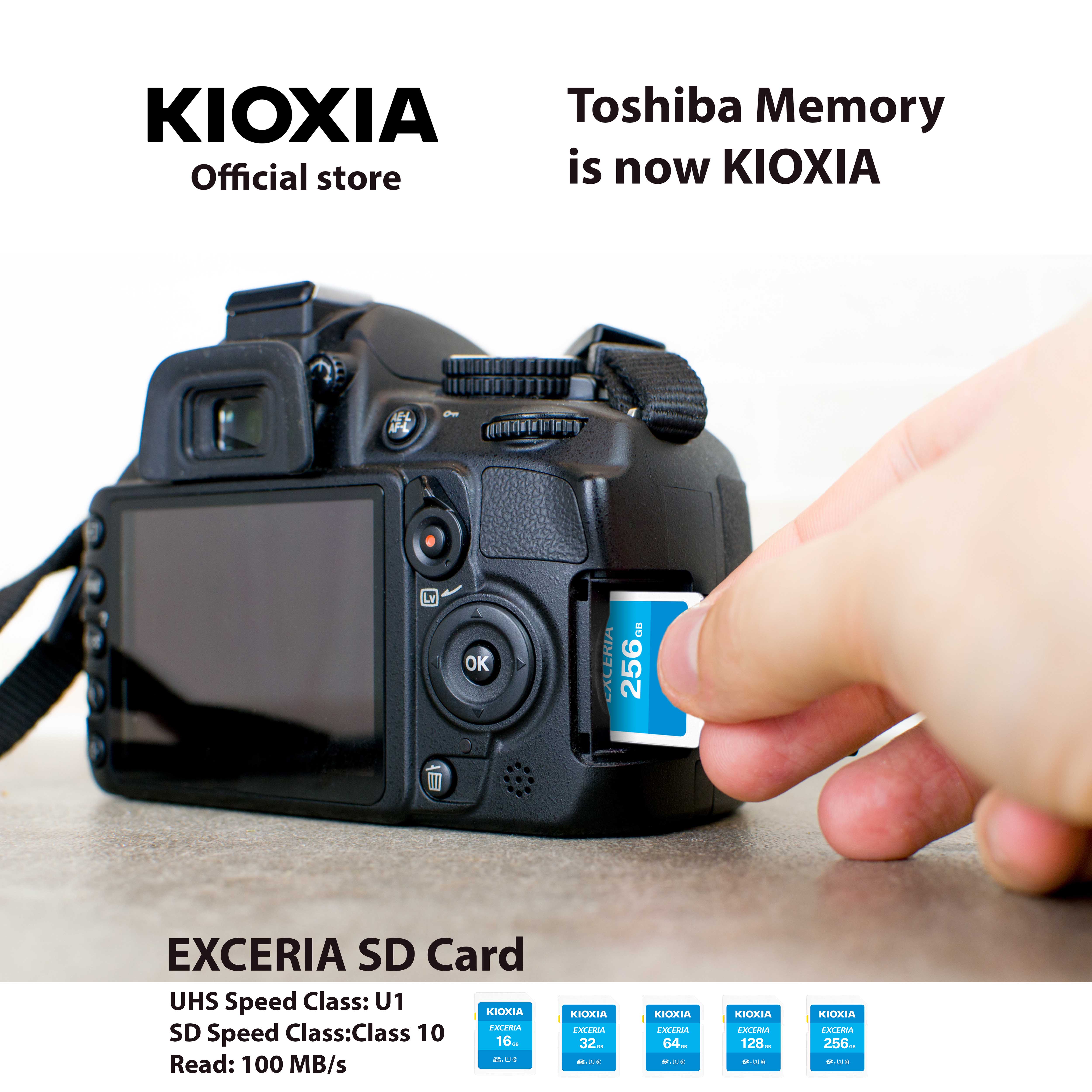 EXCERIA SD Memory CardSolid SimplicityKIOXIA EXCERIA SD memory cards have a read speed up to 100 MB/s(1), taking pictures and recording video on your digital camera is a breeze so you can focus on getting your best shot.Capacity16GB 32GB 64GB 128GB 256GB