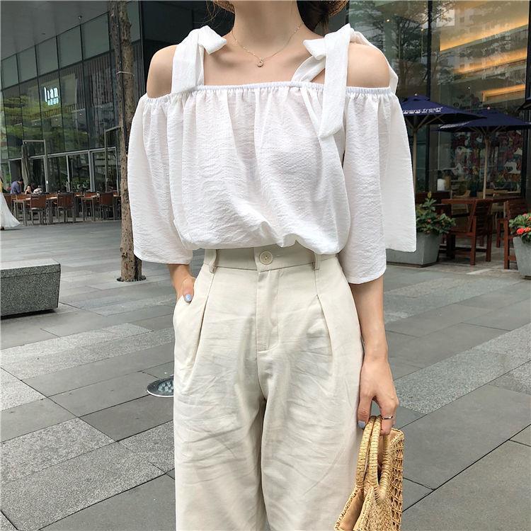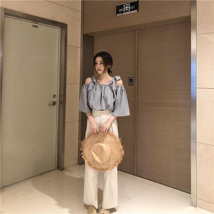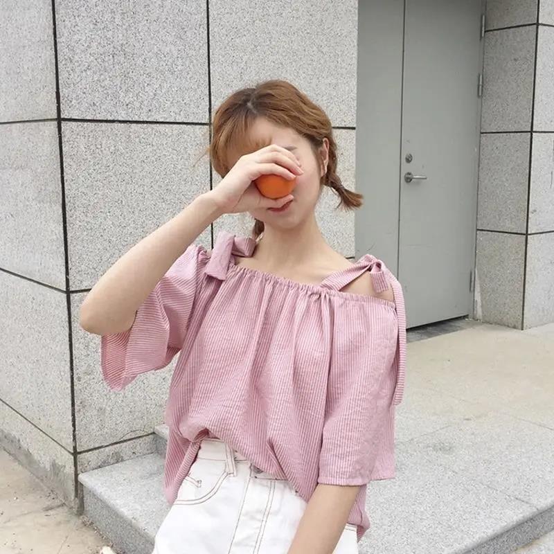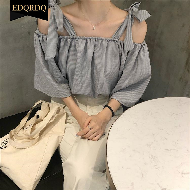 EDQRDQ Womens Summer Off Shoulder Blouse Striped Lace Up Top 3/4 Sleeve Casual Chiffon Tops Shirts