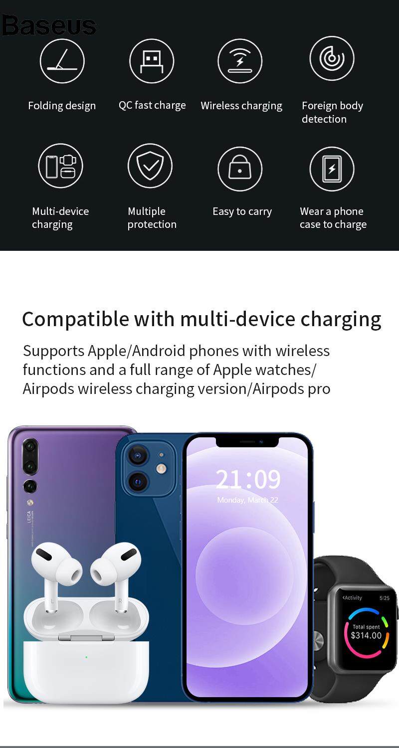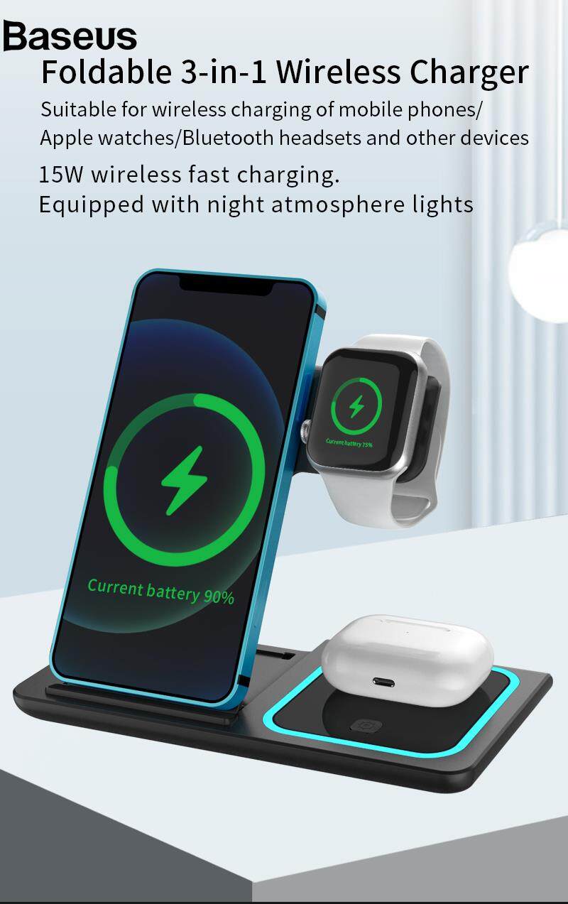 Baseus X455 Foldable 3-in-1 15W Wireless Charger Desktop Qi Fast Charging Stand Dock for iPhone Android iWatch AirPods?24hrs ship out?