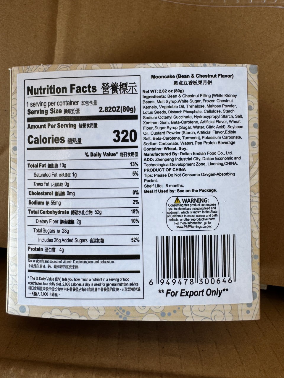 Endian Handmade Classic Bean Paste and Chestnut Mooncake [Freshly Baked, Great Value] 80g