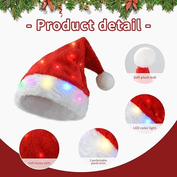 • Comfortable to wear: This lighted santa hat made of high-quality plush. High quality fabrics and thoughtful design make adult santa hats soft and have a good touch, which can protect your head and hair and ensure excellent wearing comfort